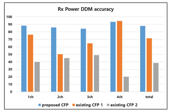 Figure 17 shows the received optical power DDM accuracy of the proposed firmware and a conventional commercial CFP transceiver. Unfortunately, the methods for calculating DDM in existing CFP are not disclosed, so technical differences cannot be compared, but they can be compared by measuring DDM accuracy. The results show that the DDM accuracy of an existing CFP product is higher than that of the proposed scheme in some channels, but the accuracy in all channels with the proposed method is higher than that of an existing CFP transceiver. Moreover, the results confirm that the deviation of the DDM accuracy among the channels in the proposed firmware is less than that resulting from the conventional method.