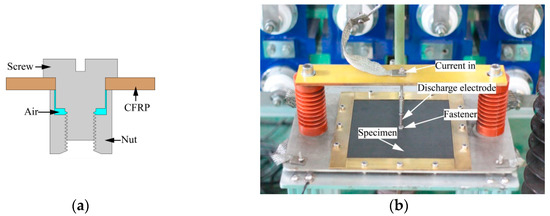 The material used in this work was a unidirectional carbon fiber prepreg (TC35/FRD-Y360). The specimen dimensions were 250 mm (length) × 250 mm (width) × 2 mm (thickness), and the stacking sequence was , creating a total of 15 plies. The diameter of the mounting hole was 8 mm, and the fastener material was stainless steel. Compared with titanium alloy, stainless steel has good electrical conductivity and a lower melting point, which will result in more severe damage during lightning strikes, which is beneficial for observation and analysis. The specimens used in this work were unpainted and unprotected. This structure allowed us to focus on the details of CFRP response to high energy discharge alone [19]. The assembly of the fastener and CFRP laminate is shown in Figure 1a. The tight fitting of the fastener and the CFRP laminate mounting hole can reduce the contact resistance between the two elements. The discharge electrode with a diameter of 8 mm was made of tungsten–copper alloy (W80Cu20) and was positioned directly above the centre point of the specimen, separated from the specimen by a distance of approximately 3 mm. The four sides of the specimen were fixed on a metal plate with detachable copper strips. For reliable grounding, four copper braids were connected at the four corners of the metal plate. The simulated lightning current was injected into the specimen as an arc discharge and then flowed through the metal plate and out through the copper braid. The clamp and connection are shown in Figure 1b.