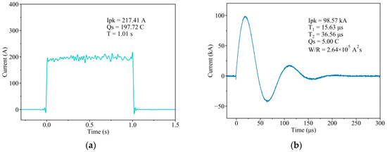 The lightning current waveforms described in [22] and [23] include four components (Figure 2). Components A, B, C, and D represent the first return stroke, intermediate current, continuing current, and the subsequent return stroke, respectively. These four components can be divided into two categories: (1) short-duration, small-transferred-charge, high-action-integral, high-current-amplitude components A and D; and (2) long-duration, large-transferred-charge, low-action-integral, low-current-amplitude components B and C. To make this study universal, lightning current components C and D were used in the simulated lightning strike test of the CFRP laminates with fasteners. The current amplitude of component C was 200 A, the duration of which could reach 1 s, and the transferred charge was 200 C; the actual test waveform is shown in Figure 3a. The current amplitude of component D was 100 kA, the duration could reach 500 µs, and the action integral was 2.5 × 105 A2s; the actual test waveform is shown in Figure 3b.