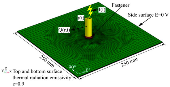 Some assumptions were proposed: no clearance between fastener and composite, and the contact electrical resistance and thermal resistance on the interface were ignored; the delamination caused by Joule heat and the thermal stress inside the specimen was not considered. The stacking sequences and dimensions of the CFRP laminate used in the finite element modeling were the same as those of the specimen. The model is shown in Figure 4. The whole model had 28,157 elements, 28,055 hexahedra, 2,200 edge elements, and 136 vertex elements. The electrical potential boundary of the model was set as follows: the electrical potential of the two parallel sides was 0 V. Heat exchange between the specimen and the environment occurred when the specimen was directly exposed to the air. Therefore, the thermal boundary of the model was set as follows: the thermal radiation emissivity of the top and bottom surfaces was 0.9; the four sides of the model were thermally insulated and did not exchange heat with the external environment; and the environmental temperature was 25 °C. The conduction current and heat flux of components D and C were imported into COMSOL and applied on the entire top surface of the fastener. For modeling of different fiber orientations, rotated coordinate systems were used and the material properties of CFRP were assigned to each layer. For each layer, the size of elements increased from the center to the four sides to improve the efficiency and ensure the accuracy at the same time. The maximum and minimum side lengths were 10 mm and 3 mm, respectively. The average element quality was about 0.9. The total time of the transient solver was set according to the duration of the waveform (300 µs for component D and 1 s for component C). In this work, the relative tolerance of the simulation model was 0.01, the tolerance factor was 0.1, the maximum number of iterations was 10, and the termination technique was the tolerance. The simulation was done on a Dell Precision Tower 780 workstation equipped with two E5-2603 CPUs and 48 GB memory, and the longest time consumed about 11 h for a calculation case. In the process of calculation, the temperature distribution and the physical parameters of the materials were monitored by the domain point probes arranged in the model to ensure the convergence of the model.