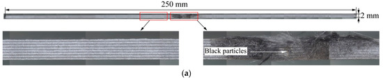 After the lightning strike tests, each specimen was cut, as shown in Figure 6c, and the cross-section of the hole was observed with a stereomicroscope (Leica/M125, Germany). Figure 6a,b are cross-sectional photos of the specimen after the action of components C and D, respectively. In these figures, the regularly spaced vertical lines are the shadows left by the synthesis of multiple cross-sectional photos, which do not represent the damage.