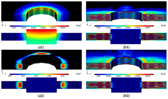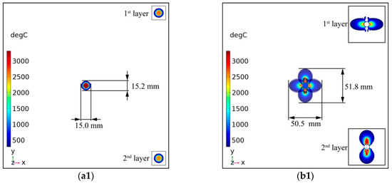 Figure 8(a1–a3) are the temperature profiles of the specimen under component C in the conduction current + heat flux, conduction current, and heat flux simulation models, respectively. Figure 8(a1,a2) indicate that the decomposition damage shape and size of the laminates are similar to each other and that the damage shape is circular. Such decomposition damage shapes, which are similar to the dark-red area in Figure 7a, do not reflect the anisotropy of the CFRP laminates because component C has a long duration, providing Joule heat in sufficient time to spread in all directions. The first layer (0° direction) and the second layer (90° direction) are two orthogonal layers, and their temperature distributions are shown in the upper-right corner and lower-right corner of Figure 8(a1), respectively. The decomposition damage shapes of the two layers are almost identical.