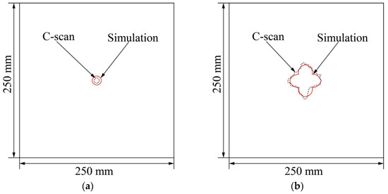 During a lightning strike, the Joule heat generated by the conduction current flowing through the laminate will cause a continuous rise in the CFRP temperature [35]. A temperature contour exceeding a specific threshold value is used to characterize the damage area in each layer [16]. The threshold value usually adopts the decomposition temperature of the resin. When the temperature exceeds this temperature, the area is considered to be the decomposition damage area. According to Table 1, the decomposition temperature of the resin is set to 300 °C [29]. Therefore, the area surrounded by the 300 °C temperature contour in the FEA represents the same effect as the dark-red area (decomposition damage) under the C-scan.