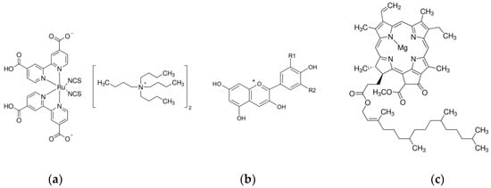 One of the most important cells’ elements is the dye that is adsorbed on titanium dioxide layer, playing a fundamental role in DSSCs because it is involved in the harvesting and conversion of solar energy to electrical energy. Organometallic dyes, which are based on ruthenium (Figure 1a) and osmium polypyridyl complexes, have been widely employed as efficient sensitizers [,], since they can absorb light in the visible range, have intense charge-transfer and highly efficient metal-ligand charge transfer. Unfortunately, this kind of metal coordination compounds is usually obtained with multistep reactions and expensive chromatographic purification procedures []. The use of organic dyes is an alternative to transition metals, leading to a significant reduction of manufacturing costs of the final device [,,]. Many organic dyes are available in nature and they can be used as such. In fact, plants are full of natural pigments that determine their colour, covering the entire solar spectrum from red to purple and that can be employed in DSSCs. Therefore, natural dye molecules can be used like a sensitizer for their low cost, good light absorbance, easily preparation process, and eco-friendly behaviour, as they are completely biodegradable. One of the most important groups of naturally occurring pigments are anthocyanins, which are responsible for red, blue, and purple colours in different plant tissues, like fruits, flower, leaves, and bulbs []. These polyphenolic molecules are available in various fruits, such as berries, grapes, pomegranates, raspberries, and many other [], and, during the impregnation process, can bind the semiconductor titania nanoparticles with their hydroxyl functional group, to obtain an electronic coupling that allows for an efficient electron transfer reaction.