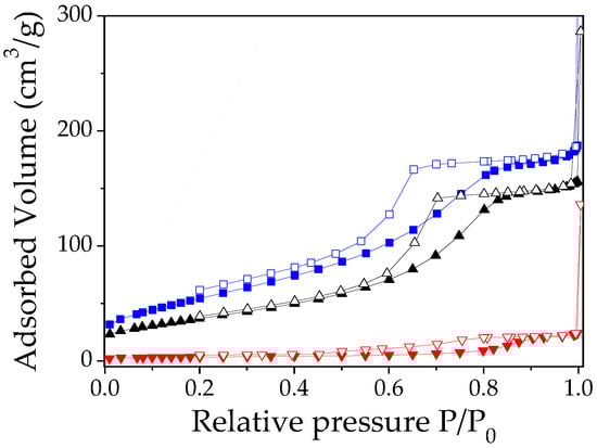 N2 adsorption-desorption isotherms at −196 °C of titania as synthetized (▼) and calcined at 400 °C (■) and 600 °C (▲). Filled symbols are referred to the adsorption branch and empty symbols to the desorption one.
