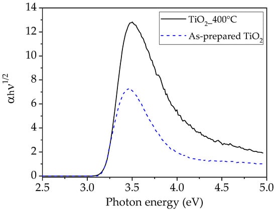 Diffuse Reflectance Spectroscopy was used to determine the band gap value of the sample calcined at 400 °C. An absorption peak in the UV region, below 400 nm, and due to an intrinsic absorption of titanium dioxide, was recorded (Figure 5).