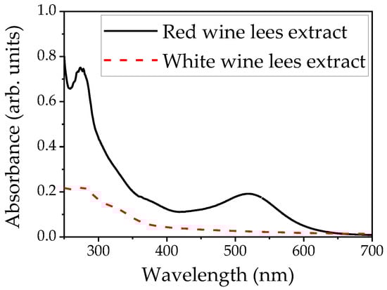 Dye extraction process was carried out valorizing the lees deriving from red and white wines, characterized by a pH value of 3.7 ± 0.5. After centrifugation of winemaking lees, the colored solid was used to extract the dyes that were used for the realization of a DSSC photovoltaic cell. Firstly UV-Vis spectra of water diluted dyes sample, extracted with ethanol in 1:1 w/w lees-solvent ratio, acidified with concentrated HCl were registered. A peak at 280 nm and a large absorption band centered at 520 nm for red wine lees and at 280 nm for white wine lees can be noticed (Figure 6). It is evident that the red extracts absorb in the visible region of light spectrum and, hence, fulfil the primary criterion for their use as sensitizers in DSSCs.