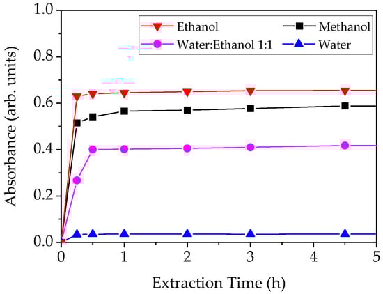 Considering that the most efficient organic DSSCs are usually based on organic dyes that consist of anthocyanins obtained from red or purple fruits [], the red extract was further investigated. Using the same conditions reported before, several extractions were conducted with different solvents (methanol, ethanol, water, and mixture thereof). The maximum absorbance of red wine extract was used to monitor the concentration of dye solution during the extraction process, as a function of the extraction time.