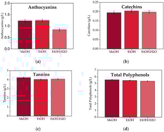 The kinetics of the dye extraction process, as shown in Figure 7, prove that the dye extraction from bentonite clay can occur in some hours. For all of the solvents used, absorbance increases very rapidly in the first hour, reaching an asymptotic behavior just after 2 h. These experimental findings suggest that, at the beginning of the extraction process, solvent desorbs dye molecules from the external structure of bentonite layers, and then extracting organic molecules located in the middle of the clay layers. After optimizing the extraction process, the organic molecules were further characterized, and the concentration of the different organic molecules that were involved in color appearance was evaluated. Figure 8 reports anthocyanins, tannins, catechins, and total polyphenols concentrations.