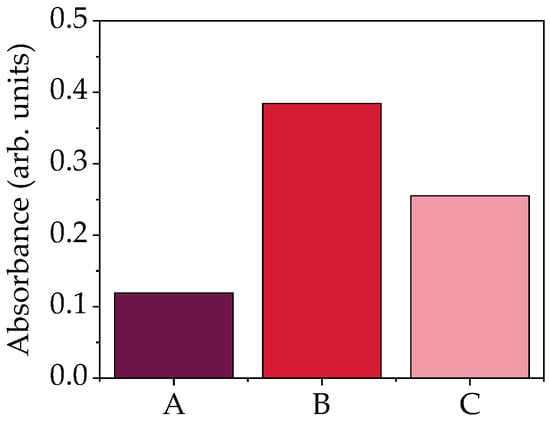 Absorbance of extracts with different extraction method and w/w lees-solvent ratio. (A) Soxhlet extraction with 1:3 less-solvent ratio, in ethanol; (B) RT extraction with 1:1 wt lees-solvent ratio, in ethanol; and, (C) RT extraction with 1:3 wt lees-solvent ratio, in ethanol.