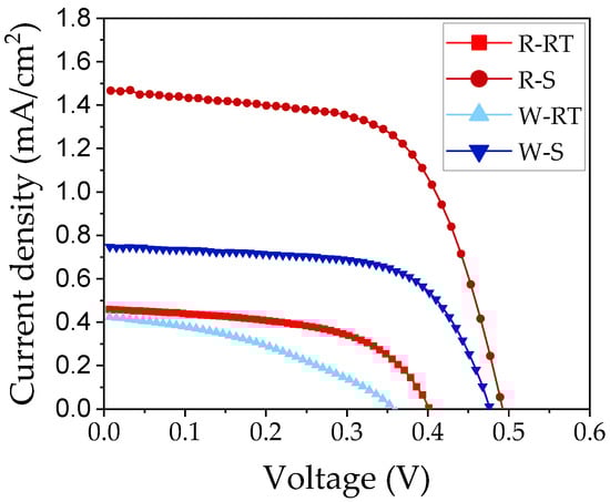 J-V curves of the DSSC prototypes realized with red and white winemaking lees extract. R-RT is the extract of red wine lees at RT; R-S extract of red wine lees with Soxhlet; W-RT is the extract of white wine lees at RT; W-S extract of white wine lees with Soxhlet.