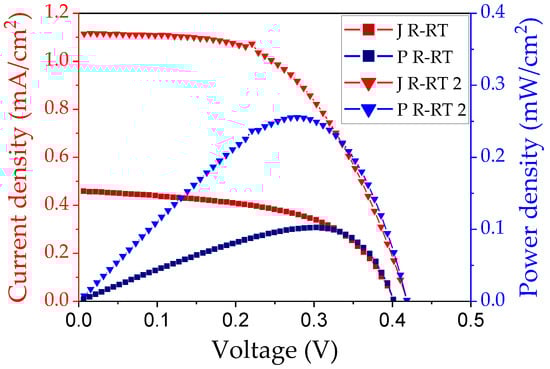 J-V and P-V curves of the DSSC prototypes realized with red winemaking lees extract. R-RT and R-RT2 are extracts of two different types of red wine lees, both at RT.