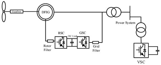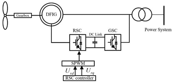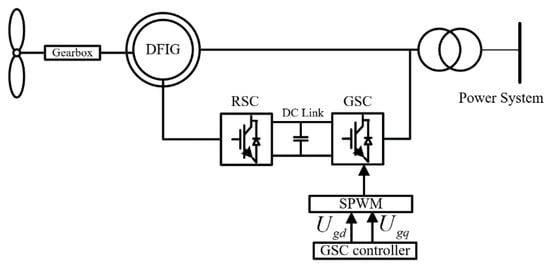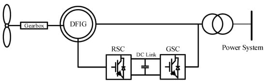 WTs can be classified into four basic categories based on the ways of speed control: fixed-speed wind turbines, limited variable-speed-controlled wind turbines, doubly fed induction generator (DFIG)-based wind turbines (DFIG-WTs), and full variable-speed-controlled wind turbines [4,5]. Among these four types of wind turbines, DFIG-WTs are mostly preferred in practical applications due to their advantages including simple installation, low cost, variable-speed constant frequency, and independent control of active and reactive power [6]. Figure 1 shows the schematic diagram of a DFIG. The stator is connected to the power grid directly, and the rotor is linked to the power grid through a back-to-back voltage source converter, which comprises a rotor-side converter (RSC) and a grid-side converter (GSC). RSC is used to control the active power and reactive power delivered and to achieve the maximum power capture. GSC is used to control the active power and reactive power delivered, as well as maintain the direct current (DC)-link voltage [1,7].