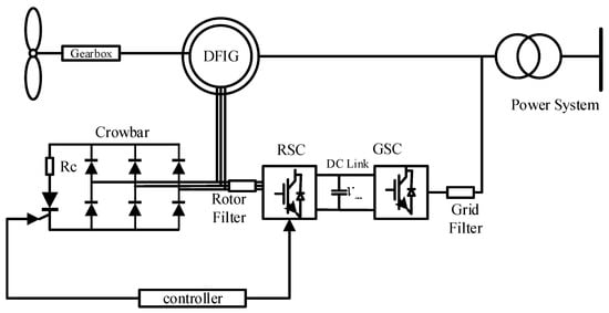 The crowbar is the most prevalent LVRT protection circuit adopted in DFIG-WTs. A crowbar circuit comprises a set of paralleled resistors installed between rotor windings and the AC-side of the RSC [18,20], as shown in Figure 4. When rotor overcurrent or DC-link overvoltage occurs, the crowbar is triggered and a low-resistance path is created to allow high currents to flow through. In this operation mode, the RSC is disconnected from rotor windings via the closed crowbar switch [21] and the damage of overcurrent can be avoided. With the crowbar circuit triggered, the DFIG-WT is transformed into a standard induction motor and the excitation control is lost. In this case, the DFIG consumes a large amount of reactive power from the power grid via stator windings, which may deteriorate the terminal voltage dynamics. In general, removing the crowbar in a timely manner can make the RSC provide reactive power to the grid as soon as possible to accelerate the grid voltage recovery. However, more crowbar connection time is needed to ensure that the natural flux is damped up to a desirable level so that the RSC can recover the DFIG control [22]. Therefore, the crowbar connection time should be chosen carefully to improve the transient stability of DFIG-WTs. Another important factor which influences the crowbar performance is the crowbar resistance. On one hand, low crowbar resistance can lead to serious rotor overcurrent and electromagnetic torque with a large peak [22]. On the other hand, increased crowbar resistance can lead to rotor overvoltage and DC-link overvoltage, which may cause damage to rotor windings. Thus, an appropriate value of the crowbar resistance should be selected to meet the aforementioned issues.