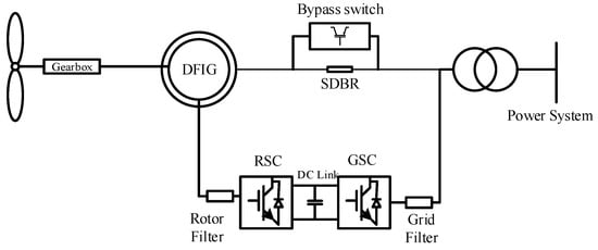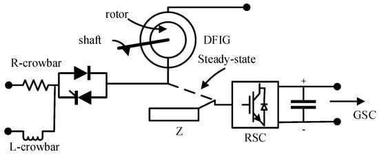 The SDR is a configuration where a dynamic resistor is put in series between rotor windings and the RSC to limit rotor overcurrent during grid voltage dips, as shown in Figure 7. The operation of the SDR is controlled by a power electronic switch: (1) in steady-state conditions, the switch is closed and the series resistor is bypassed; (2) during fault conditions, the switch turns open and a series resistor is connected between the RSC and rotor windings, where rotor current flows through the resistor [28]. Due to the specific topology, the SDR can directly control the magnitude of current. Furthermore, the limitation of rotor current can reduce the charging current to a DC-link capacitor; thus, DC-link overvoltage can be avoided [29,30]. During voltage dips, the high rotor voltage is shared by the series resistor, and the continuous operation of converter can be guaranteed. By maximizing the operation time of the RSC, more reactive power can be generated from DFIG-WTs to support the terminal voltage.