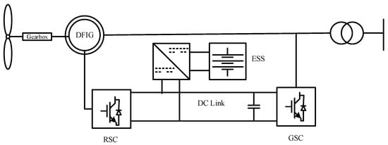 The ESS acts as a buffer in DFIG-WTs with the function of keeping the DC-link power flow through charging/discharging [32]. Typical DC-link ESS configurations include indirect DC-link ESSs and direct DC-link ESSs. Figure 9 shows the topology of an indirect DC-link ESS, which comprises a battery and a buck-boost converter acting as a DC/DC converter. The battery is connected in paralleled with the DC-link, and the energy storage system is able to share the DC-link with the GSC when it is activated [33]. By applying an indirect ESS to the DC-link, DFIG-WTs have better capability to control DC-link voltage and balance the power flow in the system [34]. Due to the specific structure, the ESS can smooth the steady-state active power output. During transient periods, the ESS can endow the RSC with the ability to provide enough reactive power support via additional demagnetizing current injection. Thus, the terminal voltage dynamics can be improved. To reduce costs and increase efficiency by avoiding converter losses, a direct DC-link ESS configuration was proposed in Reference [35]. In this topology, the energy storage is connected in parallel with the DC-link without any extra converter. Moreover, the direct DC-link ESS also shows the desirable capability to smooth output power during voltage dips. However, the demagnetizing current which is injected from converters into the rotor circuit may result in rotor overcurrent.
