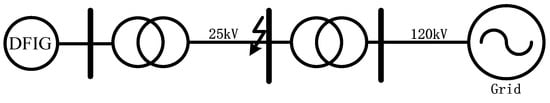 Rotor-side external retrofit techniques have a desirable control effect in restraining rotor overcurrent, controlling DC-link voltage, and improving terminal voltage dynamics. To compare the control effect of various rotor-side external retrofit techniques, a single-machine infinite bus (SMIB) system was established, as depicted in Figure 11. The rated active power of the wind farm was 9 MW with six 1.5 MW DFIG-WTs, and the detailed models of DFIG-WTs were provided by Matlab/Simulink R2016a. The wind speed in the wind farm was maintained as a constant of 15 m/s. A three-phase to ground fault with grounding resistance of 0.5 Ω occurs at the end of 25 kV feeder at 0 s, and the fault is cleared at 0.1 s. According to the GCR for LVRT, the maximum limit of rotor current was set as 2 p.u. Typical models of an active crowbar [20], SDR [30], ESS [36], and DC chopper [25] were implemented in MATLAB/Simulink for simulation. The durations of the active crowbar circuit and SDR were set as 0.02 s, while the ESS and DC-chopper remained activated during grid fault. The comparative results are shown in Figure 12.
