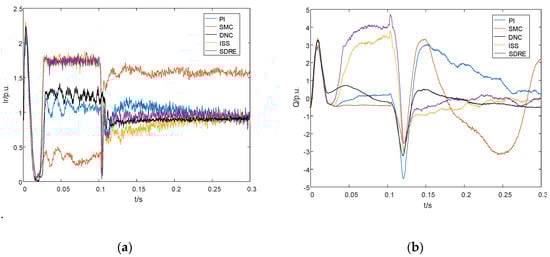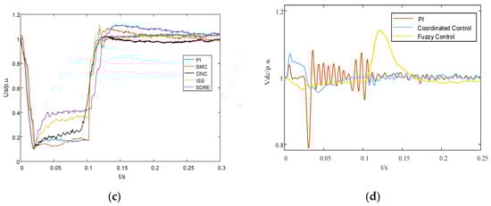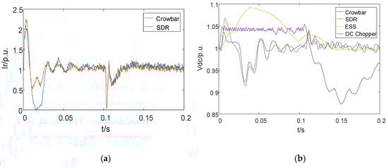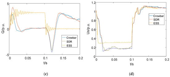 Figure 12a shows the control effect in restricting rotor current. Since the ESS and a conventional DC chopper may result in rotor overcurrent, they are not included. As shown in Figure 12a, the active crowbar circuit shows better performance in restricting rotor overcurrent compared with the SDR, because it creates a low-resistance path to allow high-current flow through during transient periods. The desirable control effect in restricting rotor current endows the active crowbar circuit with the ability to avoid overcharging in DC capacitors, such that the active crowbar circuit can restrain DC-link overvoltage better than the SDR, as shown in Figure 12b. The DC-chopper can maintain DC-link voltage in an acceptable range by quickly discharging the excess active power in the DC-link. Figure 12c shows the comparative results of transient reactive power support. Since the SDR maximizes the operation time of the RSC, more reactive power is generated when the SDR is applied compared with the active crowbar circuit. The ESS offers more transient reactive power support during transient periods, which results in better terminal voltage dynamics, as shown in Figure 12d. Since the reactive power generation mainly depends on RSC control, the active crowbar circuit and SDR provide a similar control effect for supporting terminal voltage. The DC-chopper has no control effect on reactive power support and voltage dynamics improvement; thus, it is not presented in Figure 12c,d.
