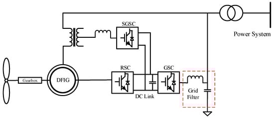 The SGSC is a bidirectional power converter connected across the DC-link, as shown in Figure 18. The SGSC has the capability to regulate DC-link voltage by controlling the active power injection or absorption. Another function of the SGSC is to compensate for stator harmonic voltages by synthesizing a harmonic voltage content. In order to offset the influence of negative-sequence grid voltage, the SGSC is capable of injecting series compensation voltage to balance the stator voltage. The stator flux can also be controlled by the series voltage injection through the SGSC [55,56,57,58].