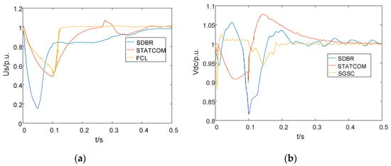 Stator-side external retrofit techniques show desirable performance in maintaining the terminal voltage and restraining DC-link overvoltage. To compare the control effect of various stator-side external retrofit techniques, the same test system and fault conditions as in Section 3 were adopted. Typical models of an SDBR [44], STATCOM [50], FCL [53], and SGSC [57] were implemented in MATLAB/Simulink, and the results are shown in Figure 19. Figure 19a shows the control effect in maintaining terminal voltage. By providing fast and smooth reactive power compensation, the STATCOM provided better performance in improving the terminal voltage dynamics than the SDBR. In addition, the FCL could maintain terminal voltage regulation by injecting reasonable resistance into the stator circuit and providing adaptive voltage compensation. The SGSC focuses on keeping terminal voltage balanced and sinusoidal; thus, it is not presented in Figure 19a. Figure 19b shows the control effect of maintaining DC-link voltage. By controlling the active power injection or absorption, the SGSC can regulate DC-link voltage during grid faults. The SDBR aids the RSC and GSC in maintaining controllability of DC-link voltage. However, more serious DC-link voltage drops occurred when the SDBR was implemented in DFIG-WTs compared with the SGSC and STATCOM.