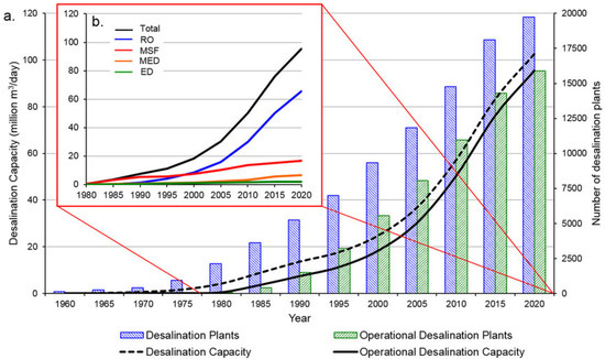 (a) Global installed desalination capacity 1960–2020, (b) operational capacity by desalination technology. Reproduced with permission from E. Jones et al., Science of the Total Environment); published by ScienceDirect, 2019 [5].