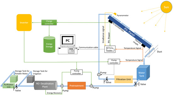 Such a system would use the water itself to store the excess energy generated by the PV system. Thus, the higher the excess of energy generated by the solar system is, the lower the salinity level, and the higher the volume of the desalinated water (and vice versa). Figure 4 is a schematic diagram of the designed system.