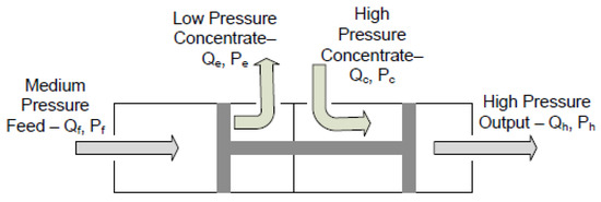 There are many different types of reverse osmosis energy recovery devices. Researchers have spent decades perfecting devices that capture and recycle otherwise wasted pressure energy, making industrial systems in desalination more economical and reliable. An energy recovery device transfers the wasted energy at the membrane exit from the retentate flow, and passes it back to the incoming raw water, dramatically lowering the power required to operate the system. Here, the Clark pump pressure exchanger produced by Spectra Watermakers [15] is an example. The Clark pump is a fixed-ratio pressure exchanger consisting of two pistons connected with a rod, as shown in Figure 5. When the piston reaches the end, a reversing valve switches the brine and exhaust connections, and then the piston reverses its direction. The area of the rod changes the effective areas on either side of the piston, and thus the energy in the “medium pressure feed” is added to the energy in the “concentrate,” producing water at a higher pressure [16].