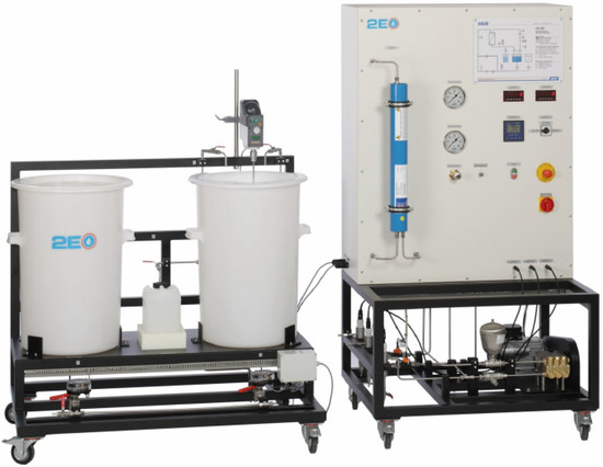 A CE530 apparatus was used in this work and is shown in Figure 6. The CE530 is designed for the desalination of NaCl solution of up to 4 wt % maximum, with a maximum permeate capacity of 250 L per day. This amount of permeate water production is minimal and is only used for experimental laboratory purposes. The reason for using this plant is its ability to operate at different pressure levels.