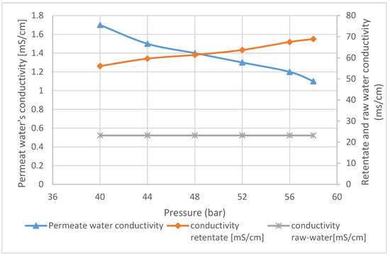 As shown in Figure 7, the conductivity of the raw water stayed constant; the reason behind this is the feeding back of the retentate water and the permeate water to the tank of raw water. Moreover, the raw water tank was attached to a sterilizer, which was used to help in keeping the conductivity constant while adding retentate and permeate water synchronously back to it. Keeping the conductivity of the raw water constant is important to accurately investigate the relation between the applied pressure and the salinity, which have been noticed to be directly proportional.