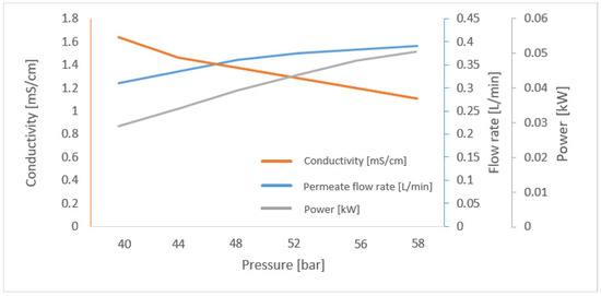 As is also shown in Figure 7, the conductivity, which is an indicator of the salinity, of the permeate water decreased with increasing applied pressure. Increasing applied pressure means increasing the consumed power, but also decreasing the amount of dissolved salts in the permeate water. Furthermore, it can be noticed that the salinity of the retentate water increased with increasing pressure. Adding the salinity of the retentate water to the salinity of the permeate water, while taking into account the flow rate for both of them, will clearly be equal to 23.2 mS/cm, which is the conductivity of the raw water as it is shown.