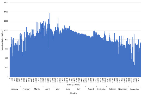 Solar irradiation at 10-min intervals over one year [19,20].