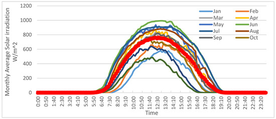 It can be seen from Figure 10 that June had the highest average irradiation rate of all the months, while December had the lowest average irradiation rate of the year [19,20]. The maximum average irradiation in June was 993 W/m2, while the maximum average irradiation in December was 487 W/m2. The yearly average solar radiation profile is shown by the red dotted line, and it is illustrated clearly in Figure 10. The yearly average solar irradiation was 762 W/m2.