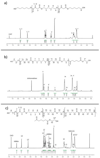 The synthesized copolymers were characterized by FTIR and 1H NMR to confirm their molecular structures. The FTIR spectra of all PEAs (supplementary materials, Figures S4–S18) clearly show the characteristic absorption band for ester carbonyl stretching at 1732 cm−1. In addition, the stretching and deformation bands of the conjugated double bond can be found at 1631 cm−1 and 814 cm−1, indicating that the unsaturated double bond does not get attacked during the reaction. For PEAs with higher amide content, the FTIR spectra show two small vibrations at 1538 and 3306 cm−1, corresponding to the amide and the N-H bonds.