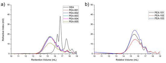 GPC traces of all PEAs synthesized in the course of this study. (a) PEA-001-005; (b) PEA-101-103.
