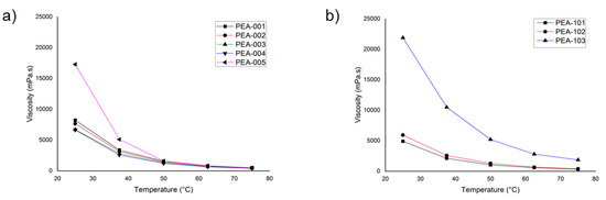 Viscosity curves of PEA synthesized in the course of this study. (a) PEA-001-005; (b) PEA-101-103.
