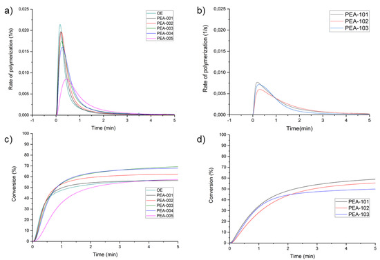 Photo-curing of OE and PEAs. (a) rate of polymerization of PEA-001-005; (b) rate of polymerization of PEA-101-103; (c) free double-bond conversion PEA-001-005; (d) free double-bond conversion PEA-101-103.