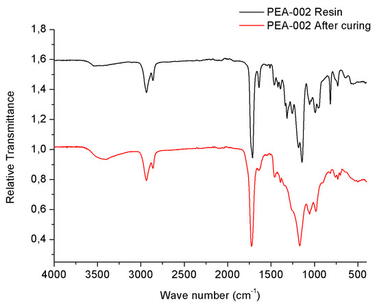 The curing of the samples is also visible in the FT-IR spectra before and after curing. Figure 6 shows the FT-IR spectra of PEA-002. The C=C stretch (1639 cm−1) and C=C deformation (816 cm−1) vibrations are significantly reduced after curing.