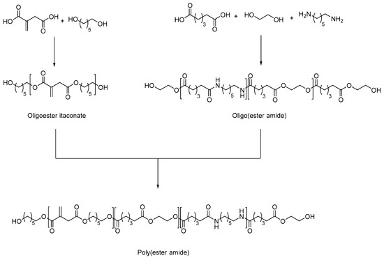 Therefore, more sophisticated synthetic procedures have to be developed in order to synthesize poly(ester amide)s derived from itaconic acid without the consumption of the unsaturated double bond. This class of unsaturated polymers is of high interest as the amide groups can have a considerable impact on the properties of the materials before and after curing. Herein, two different synthetic strategies are presented that allow for the synthesis of unsaturated aliphatic poly(ester amide)s from itaconic. To the best of our knowledge, this is the first example of this kind of polymeric resins. In addition, the materials are characterized and examined on their suitability to be utilized as UV-curing polymers in coating applications.