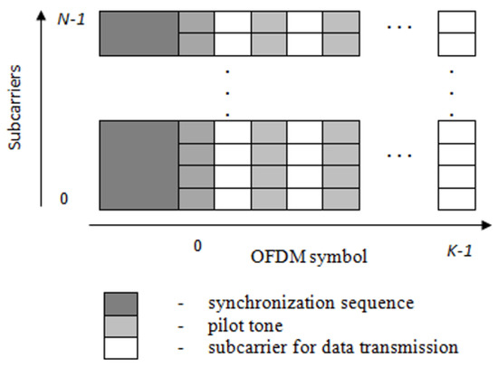 The signal transmitted in the UAC channel suffers from time dispersion, which manifests itself as selective fading of the signal spectrum. To reduce the negative effects of this phenomenon on the information detection process, some of the OFDM symbols’ spectra are used as reference pilot tones to equalise the values of the subcarriers of the symbols which are carrying the data. Every second time domain OFDM symbol is transmitted as a pilot symbol and all of its OFDM subcarriers carry data that is known in the receiver. Such a pilot tone pattern is shown in Figure 1.