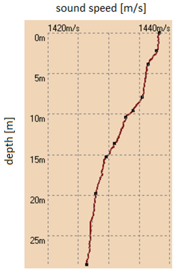 In order to estimate the transmission parameters of an inland shallow-water channel, the measurement tests were conducted in Wdzydze Lake on the northern edge of the Bory Tucholskie forest complex ( N E) on 5 May 2017. Wdzydze Lake is a freshwater lake. Its bottom is covered with a layer of mud and it falls steeply into the depths of the water. It is, in many respects, very similar to the Baltic Sea. A significant part of the lake area is more than 40 m deep, and the deepest area is more than 70 m deep. In terms of chemical composition, the waters of Wdzydze Lake represent the calcium bicarbonate type. The water temperature on 5 May 2017 was 15 °C. The weather was windless, it was not raining, and the water surface was calm. The transmission stand was placed on a boat, which was drifted very slowly. The receiving stand was in a measuring container of fixed position, 50 m from the lake shore, by a floating platform. The transmission transducer was sunk to a depth of 10 m, regardless of the water depth of about 20 m. There were no objects in the water near this transducer. The receiving transducer was sunk to a depth of 4 m. The water depth in this place was 7 m [10]. The distance between the transmitter and receiver was 1035 m. This was measured with the use of a 19x HVS GPS receiver by Garmin, which was integrated with MaxSea software by TimeZero and electronic maps by Jepessen. Such a hardware-software set ensured a distance measuring accuracy of 3 m. Figure 2 shows the positions of the transmitting and receiving stands. The water depth on the line between positions of transmitting and receiving stands is varying from 7 to 40 m. Figure 3 shows the sound speed profile measured by using a sound speed meter constructed in Department of Sonar Systems, Gdansk University of Technology. The device uses a direct method of sound speed measurement. Its accuracy is ±0.5 m/s. The sound speed profile was needed for estimating the underwater system range. On the basis of this profile an expected minimum range of the UAC system was calculated equal to 400 m.