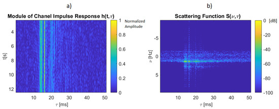 The scattering function is the basis for the calculation of the transmission parameters: delay spread , Doppler spread , coherence time , and coherence bandwidth , which are used for designing the physical layer of the UAC data transmission system [8,12]. The delay spread is calculated on the basis of Power Delay Profile (PDP) , which is obtained as the integral of over the Doppler shift domain. It describes the average signal power reaching the receiver as a function of delay and it characterizes the time dispersion of the channel. The time dispersion can be assessed as a maximum delay spread measured at a given threshold level of , or as an rms value :