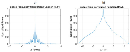 After averaging over the and domain, Space-Frequency Correlation Function (SFCF) and Space-Time Correlation Function (STCF) are obtained (Figure 6). The coherence bandwidth , in which the signal amplitude spectrum is flat and its phase characteristic is linear, is calculated as the width of at a given threshold level . The threshold level is usually equal to 0.5 or 0.9 in the case of OFDM radiocommunication systems [8]. The coherence time , specifying a time interval at which TVIR remains constant, is calculated in the same manner on the basis of . During the inland-water experiment, both the coherence bandwidth and coherence time were calculated at threshold levels of 0.5, 0.7, and 0.9 of the maximum value of the corresponding correlation function. The coherence bandwidth values obtained were equal to 124.84 Hz, 68.54 Hz, and 36.74 Hz, respectively. These values are typical for shallow-water channels with multipath propagation. Usually, the coherence bandwidth of such a channel is in the order of several dozen Hz. The coherence time was equal to 3.03 s, 1.16 s, and 0.36 s, respectively, for all three cases of threshold levels. The values of all transmission parameters are shown in Table 1.