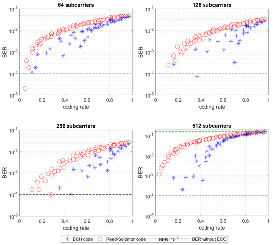 Implementing the ECC technique allowed obtaining the BER less than in the case of 64, 128, and 256 subcarriers. Only in the case of 256 subcarriers, it was possible using both types of ECC: BCH codes and Reed-Solomon codes. The highest transmission rate with the BER less than was obtained using Reed–Solomon code and it was equal to 653.63 bps. Thus, applying the ECC reduces more than twice the transmission rate compared to the configuration without ECC, but with a significant gain on reliability.