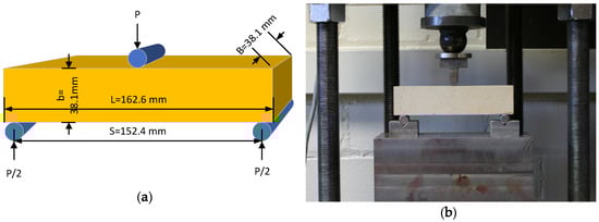 where σf represents the flexural strength, P represents the applied load, S represents the support span (152.4 mm), B represents the width of the specimen (38.1 mm), and b represents the thickness of the specimen (38.1 mm).