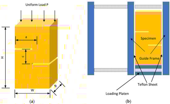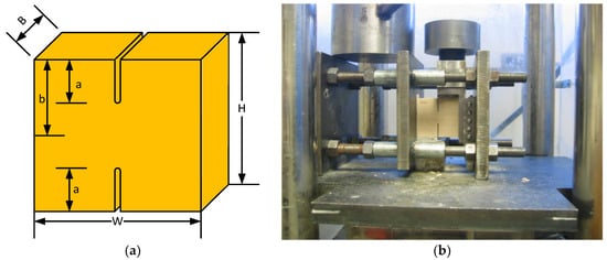 The width W, height H, and thickness B of the single-shear test specimens were 76.2, 71.12, and 25.4 mm, respectively. Figure 5 presents the specimen geometry and the test set-up. The top and bottom of the specimens had a straight-through notch with a length of a = 25.4 mm. Rollers were mounted between the guide frame and the loading plate on the right side to enable the loading plate to move freely vertically and reduce the friction between the right guide frame and the loading plate. To prevent the guide frame from falling or tilting during the experiment, a heavy weight was mounted on top of the left guide frame. The left guide frame was set once the specimen was mounted in the guide frame so that the specimen was laterally constrained to facilitate in-plane shear failure in the specimen.