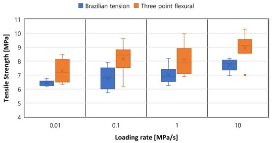 The average values of the tensile strength in the Brazilian tension test for loading rates of 10−2, 10−1, 100, and 10 MPa/s were 6.4, 6.8, 7.0, and 7.7 MPa, respectively. The average values of the tensile strength in the three-point flexural test for loading rates of 10−2, 10−1, 100, and 10 MPa/s were 7.3, 8.2, 8.1, and 8.9 MPa, respectively. The tensile strength in the three-point flexural test was approximately 16.0% higher than that in the Brazilian tension test. Figure 9 presents a comparison of the tensile strength between the Brazilian tension and three-point flexural tests. The figure indicates that the variation in strength in the three-point flexural test was greater than that in the Brazilian tension test.