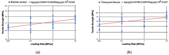 In Figure 10, the tensile strength is plotted in a log-log scale according to the loading rate. A linear-regression analysis based on the tensile strength and loading rate gave a stress corrosion index (n) of 38 with a standard deviation of 8 for the Brazilian tension test and a stress corrosion index (n) of 38 with a standard deviation of 14 for the three-point flexural test. For the Brazilian tension test, the variation in tensile strength was lower, and the standard deviation of the stress corrosion index was smaller.