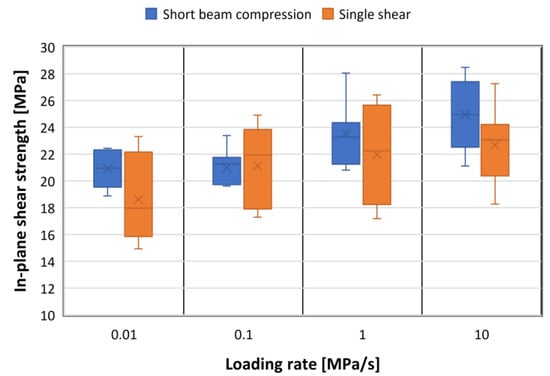 The average values of the in-plane shear strength in the short-beam compression test for loading rates of 10−2, 10−1, 100, and 10 MPa/s were 20.9, 21.0, 23.5, and 24.9 MPa, respectively. The average values of the in-plane shear strength in the single-shear test for loading rates of 10−2, 10−1, 100, and 10 MPa/s were 18.6, 21.1, 22.0, and 22.7 MPa, respectively. The in-plane shear strength in the short-beam compression test was approximately 7.2% higher than that in the single-shear test. Figure 11 presents a comparison of the in-plane shear strength between the short-beam compression and single-shear tests. The figure indicates that the variation in strength was greater for the short-beam compression test than for the single-shear test.