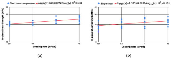 Figure 12 shows the results of a linear-regression model with the in-plane shear strength and loading rate. The stress corrosion index was n = 36 (with a standard deviation of 9) for the short-beam compression test and n = 35 (with a standard deviation of 13) for the single-shear test. For the short-beam compression test, the variation in the shear strength was lower, and the standard deviation of the stress corrosion index was smaller.