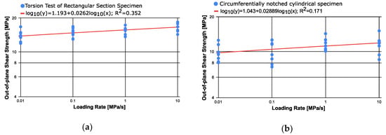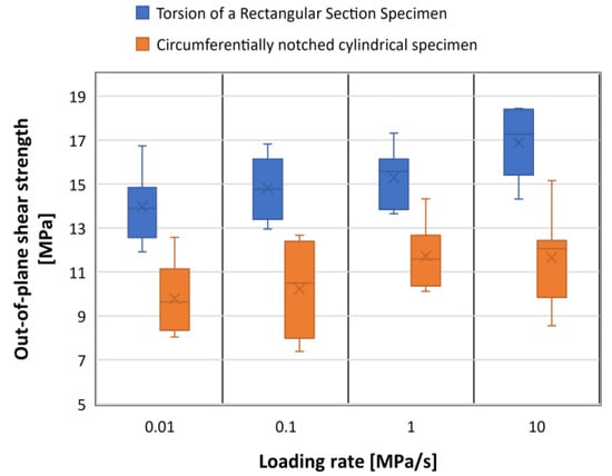 The average values of the out-of-plane shear strength in the torsion test of rectangular section specimens for loading rates of 10−2, 10−1, 100, and 10 MPa/s were 13.9, 14.9, 15.5, and 17.1 MPa, respectively. The average values of the out-of-plane shear strength in the circumferentially notched cylindrical specimen test for loading rates of 10−2, 10−1, 100, and 10 MPa/s were 9.8, 10.2, 11.7, and 11.7 MPa, respectively. The out-of-plane shear strength in the torsion test of the rectangular section specimens was approximately 42% higher than that in the circumferentially notched cylindrical specimen test. Figure 13 presents a comparison of the out-of-plane shear strength between the torsion test of rectangular section specimens and the circumferentially notched cylindrical specimen test. The variation of the out-of-plane shear strength was greater for the circumferentially notched cylindrical specimen test than for the torsion test of rectangular section specimens.